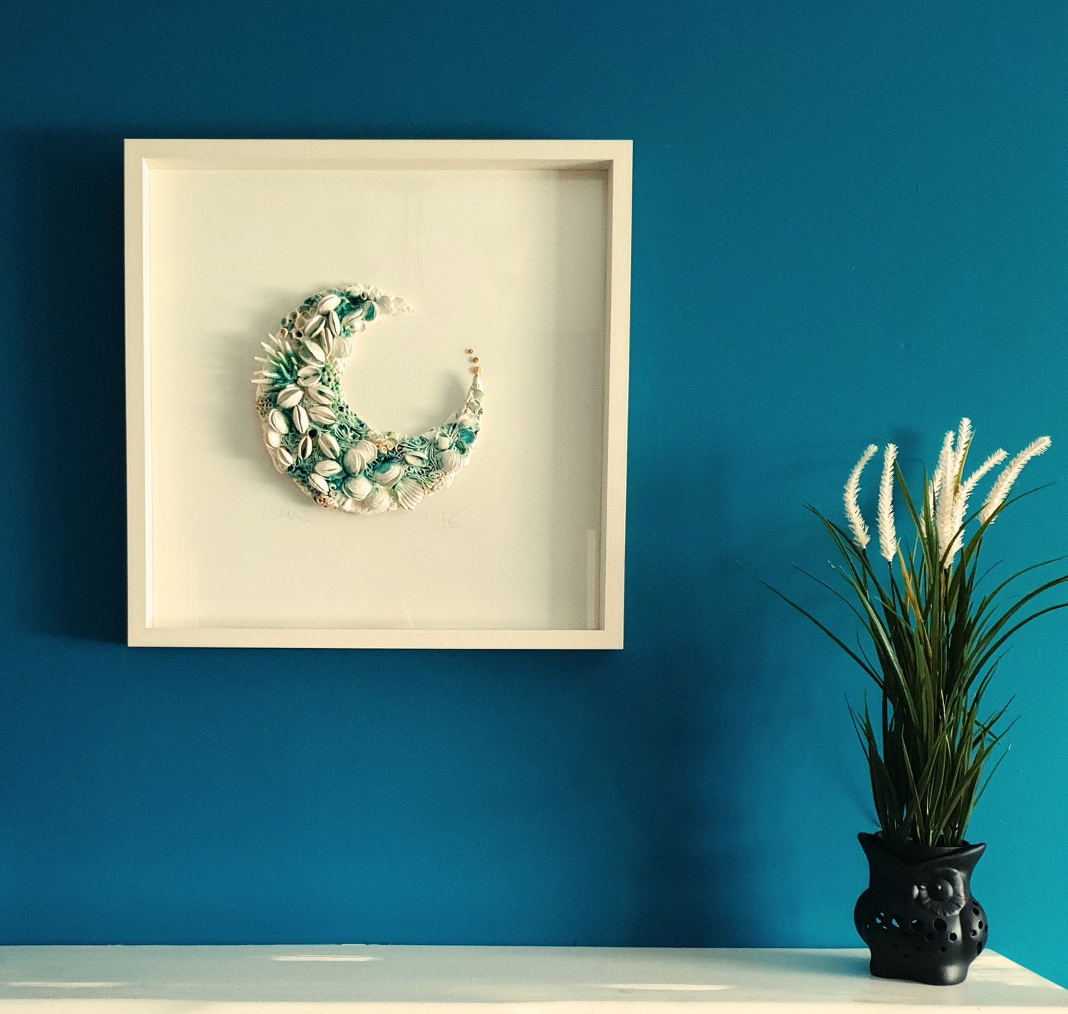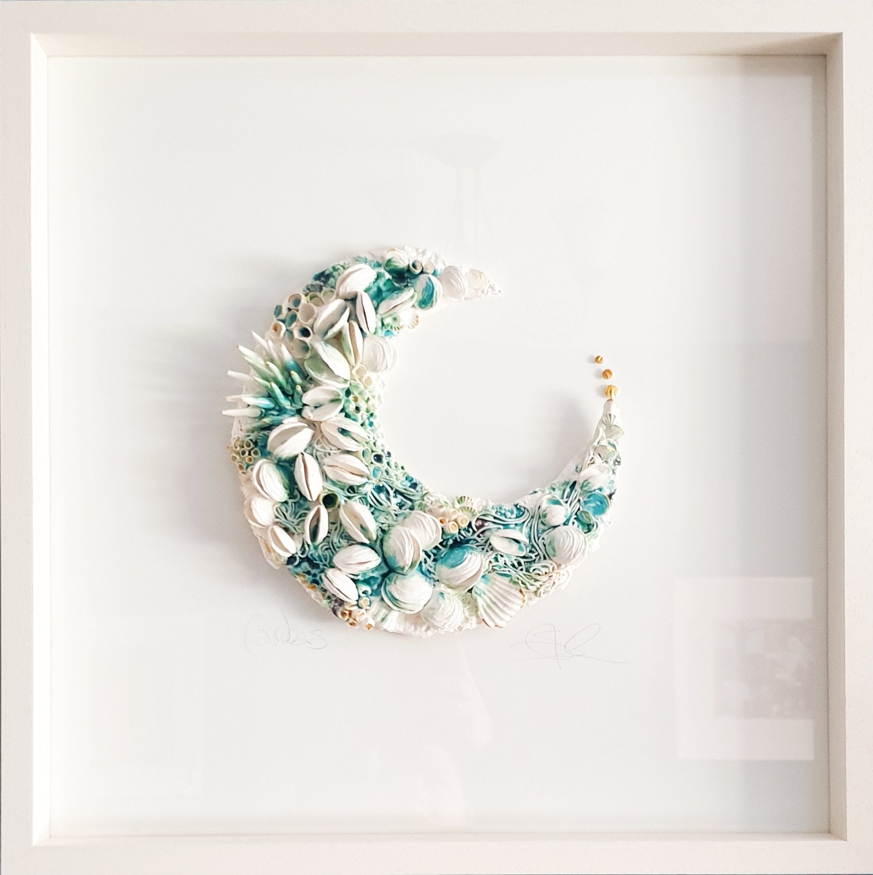 Porcelain shells arranged and dressed in turquoise green and gilded framed in a recessed white solid wood frame.