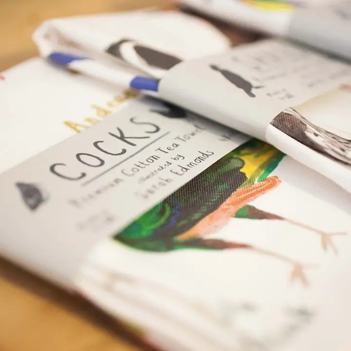 The Cocks tea towel identifies a selection of colourful birds from across the world, including Peacocks, Cockerels, Cockatoos and the vivid orange Cock-of-the-Rock species. With hand drawn illustrations and typography, this educational and cheeky design is perfect for bird and pun enthusiasts. It makes a colourful and hilarious addition to any kitchen or office and will always raise a smile. Printed on pale cream premium cotton, it measures approx 48 x 76 cm and can be washed at 30°. Packaged with a pale grey paper band printed with the design title and artist details.