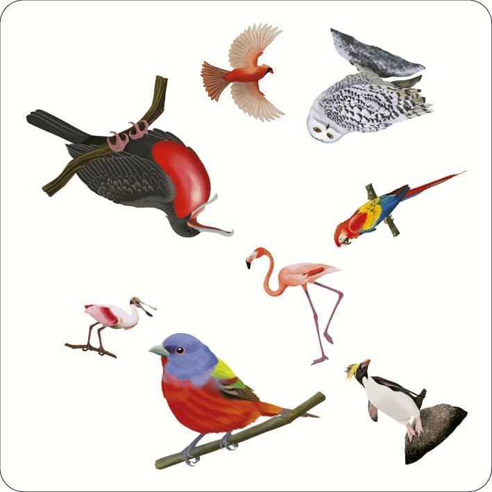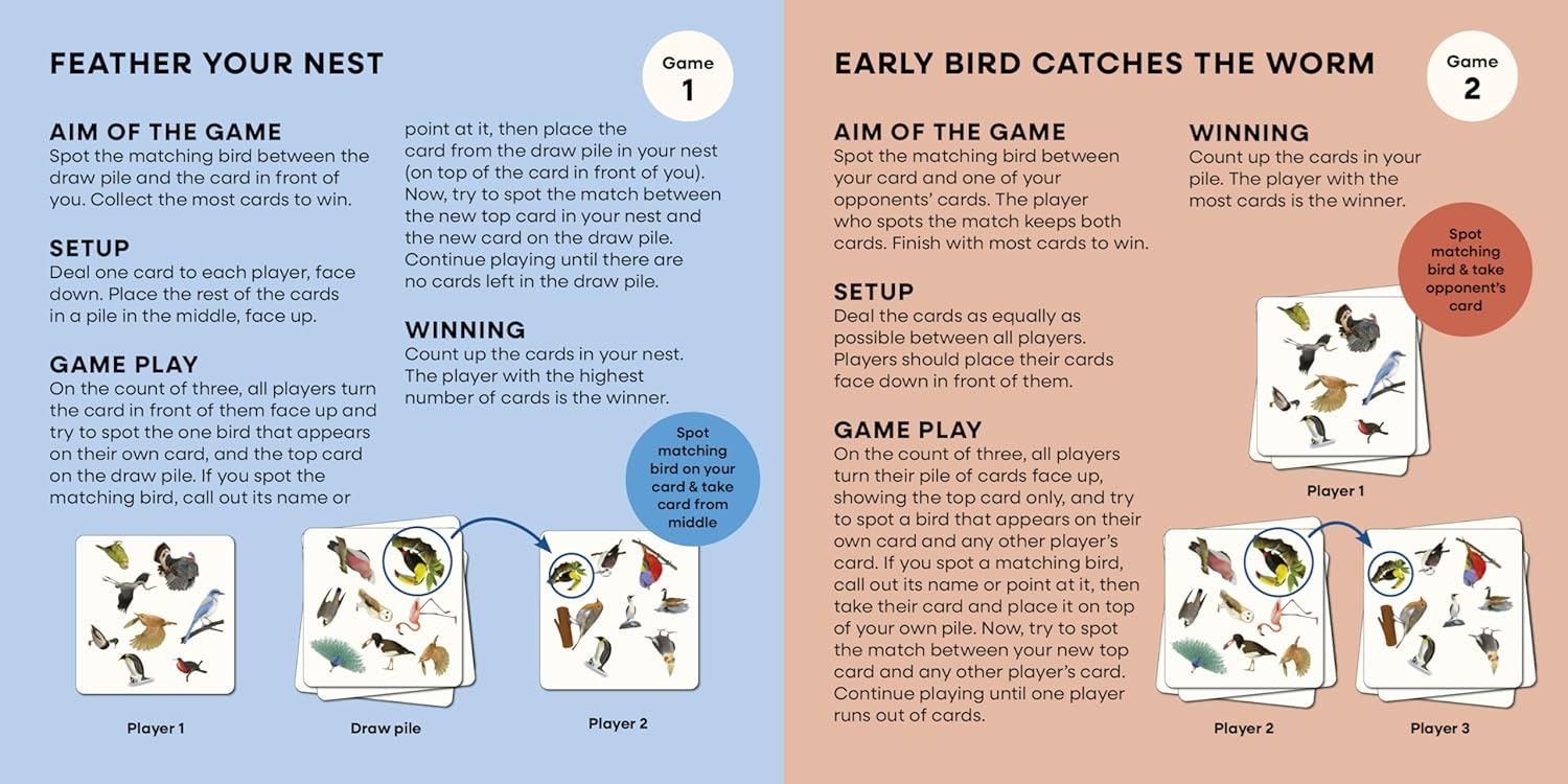 A spotting game for bird lovers: On any two cards there is one – and only one – bird in common. Will you be the first to spot it? To play the game, compare two cards and be first to spot the bird that is featured on both. There are three ways to play Bird Spotter, all suitable for 2–8 players, and they all rely on being the fastest to spot that one matching bird. You don't have to be an avian expert to play - identifiers like 'red beak', 'pointy tail' and 'green one' are all perfectly acceptable!