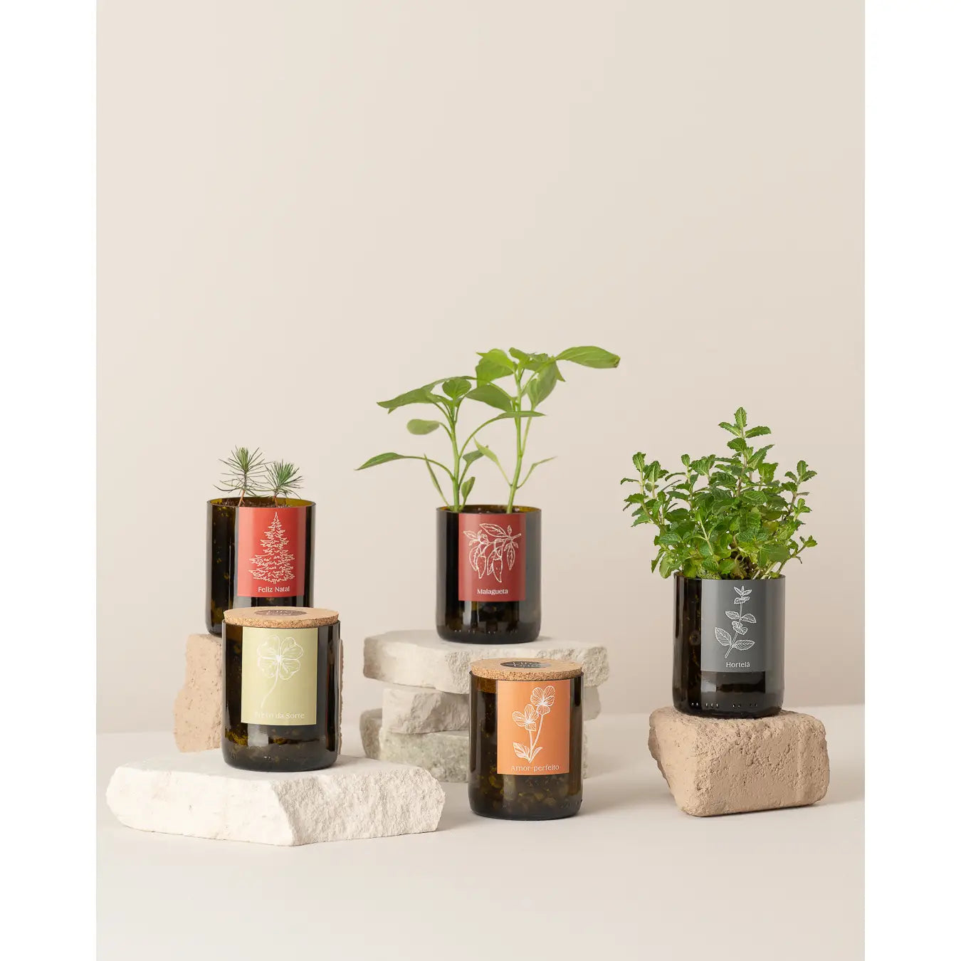 A Bottle Garden is a recycled wine bottle, with a cork stopper, that contains everything you need to feel or give the joy of sowing, caring for, and watching flowers or aromatic herbs grow. This kit is the ideal gift to show care and affection for those you love or to add a touch of color and nature to your home.
