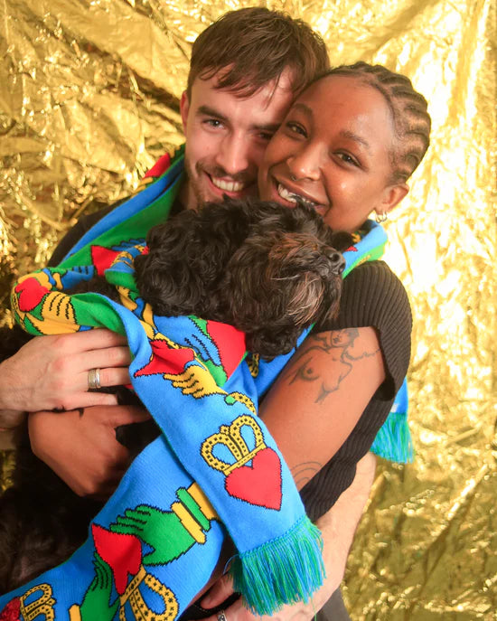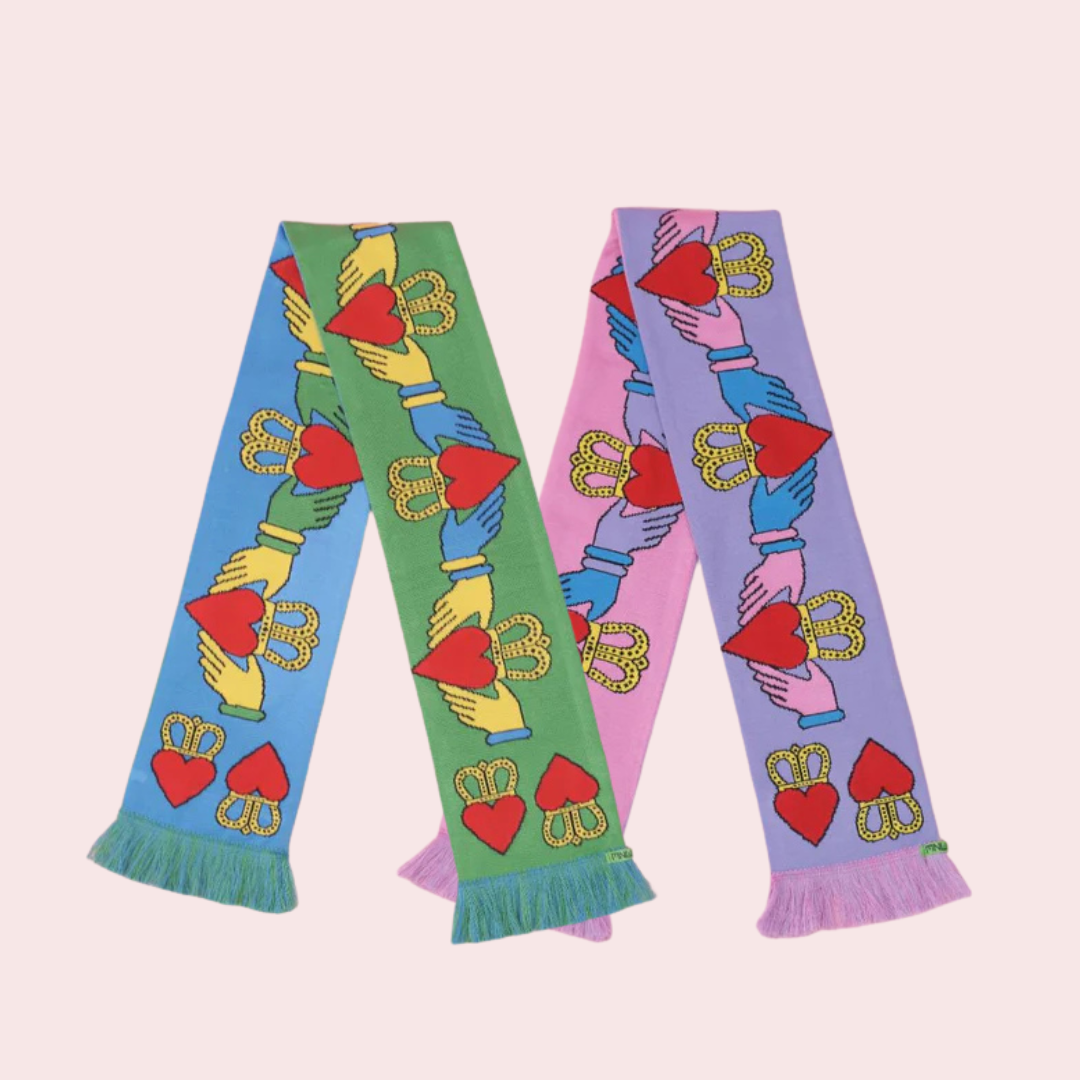 This Claddagh Scarf is a homage to the Claddagh, an Irish symbol for love, loyalty, and friendship. Colourful enough to brighten up even the most drizzly Irish day.