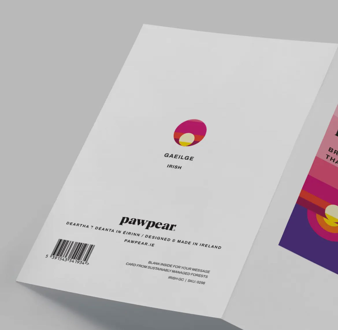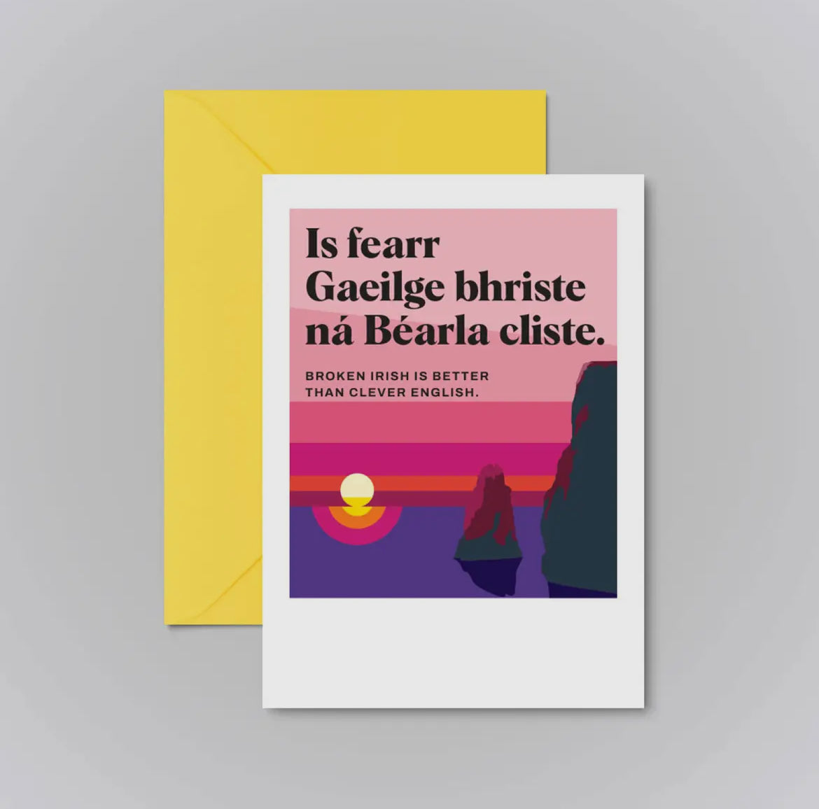 This one reads: Broken Irish is better than clever English. Comes with bright yellow envelope in compostable bag. Blank inside.