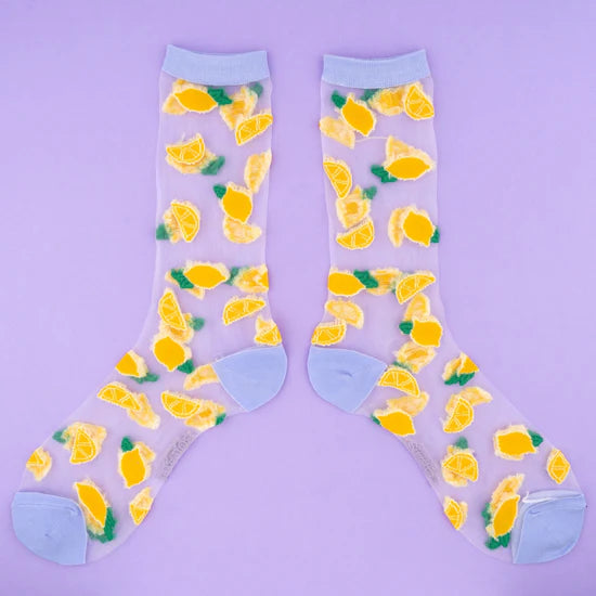 Cool sheer socks covered in cute bright yellow lemons, with lilac details.