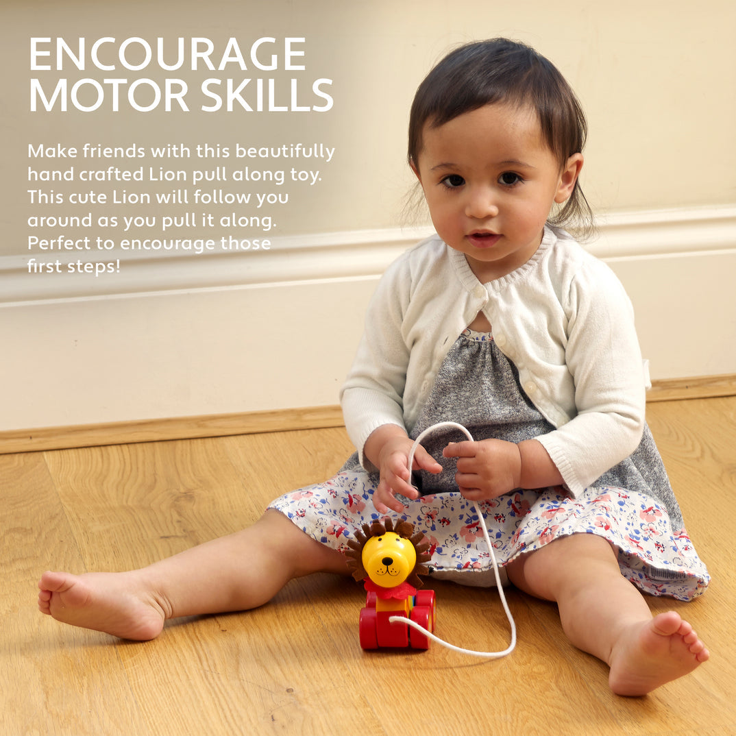 Make friends with this beautiful wooden pull along lion. Painted in bright colours, this cute lion will follow you around as you pull him along. Perfect to encourage those first steps.