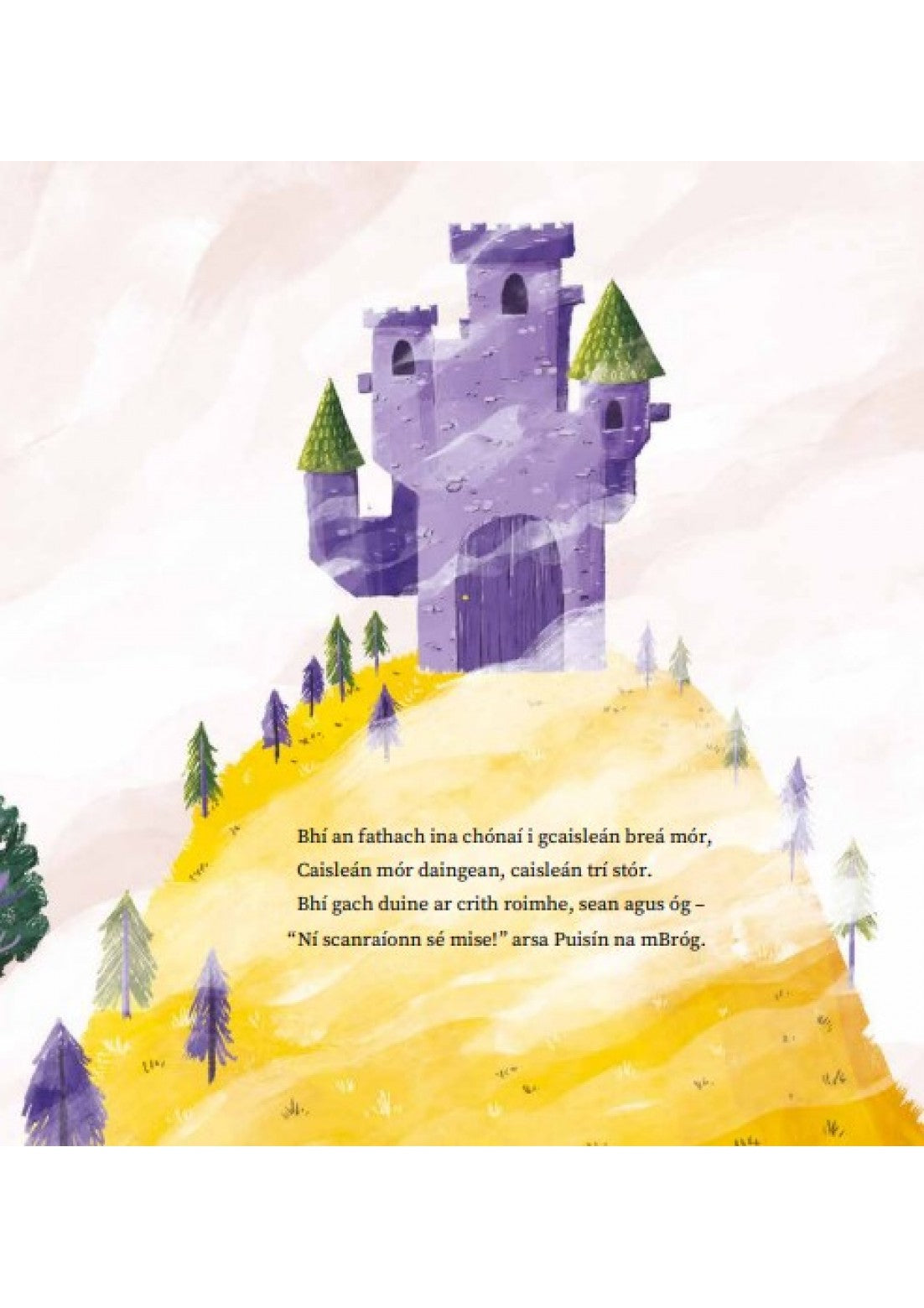 Puisín na mBróg is the third book in Futa Fata’s series of picture books in verse. It comes in the wake of the award-winning An Slipéar Gloine and Na Trí Mhuicín. Slightly longer than its predecessors, Puisín na mBróg has the same wit and charm as we follow the story of Cóilín, whose father Maidhc the Miller has just retired. He leaves his mill to his eldest son, Micil, his horse to his middle son, Páidín, and to his youngest son, Cóilín, he leaves his…. cat! Cóilín is not too impressed. But Puisín na mBróg is no ordinary cat! He can talk… and he’s got big plans!